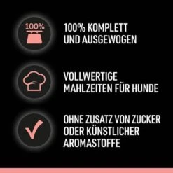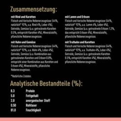 Uitgebalanceerd natvoer voor honden met vlees of gevogelte. Verfijnd met vitaliteitsrijke groenten & delicate saus. Holistisch recept met vitaminen & mineralen. 4 heerlijke varianten.
