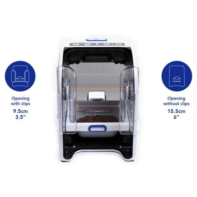 De discrete voerautomaat kan worden geprogrammeerd voor maximaal 10 dieren en gaat alleen open als de kat of hond met de juiste microchip ervoor staat. Voor zeer jonge of kleine dieren kunnen aan de zijkant ook 2 beschermingsclips worden bevestigd, zodat grotere dieren geen kans hebben bij het voer te komen. Dankzij het compacte ontwerp kun je de Closer Pets MiBowl Microchip Voerautomaat ook in kleine woonruimtes plaatsen. De vroegere merknaam Cat Mate staat voor jarenlange kwaliteit en valt nu onder de naam Closer Pets.