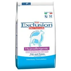 Exclusion hondenvoer met vis & aardappel werd speciaal ontwikkeld voor honden met allergieën en onverdraagzaamheden alsmede voor de behandeling van, en ter voorkoming van huidstoornissen. Het gebruikte ruwe materiaal komt van noordzeeharingen, die zich onderscheiden door een hoog gehalte aan Omega-3-vetzuren, deze ondersteunen en bevorderen het helen van huidontstekingen. De haringen worden op hoogzee gevangen en zijn derhalve niet met industriële stoffen in aanraking geweest, zoals gebruikelijk bij gekweekte vissen.
