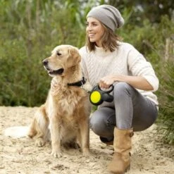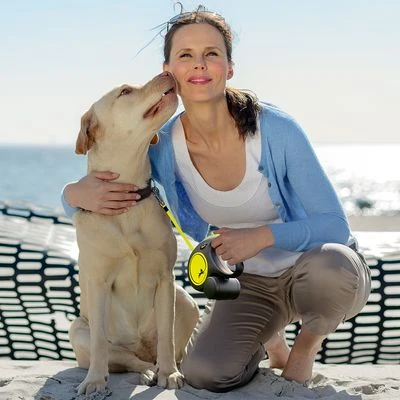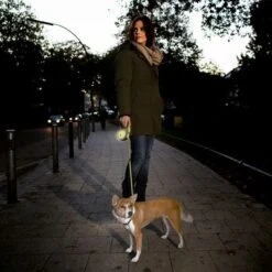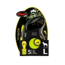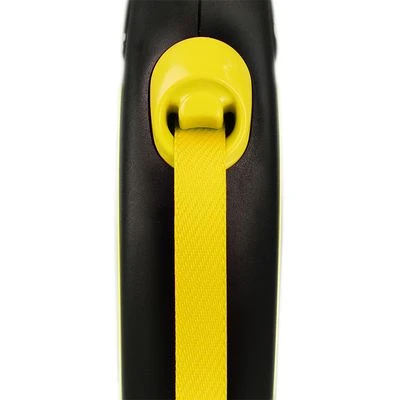 Met de flexi New Neon Rollijn zie je je hond al van ver, en ook in het donker. Op beide kanten van de zwarte behuizing zitten reflecterende stickers. Bovendien zijn de riem, drukknop en halsriem opvallend geel voor meer zichtbaarheid in het donker of op grauwe winterdagen. Tegelijkertijd krijgt je hond veel bewegingsvrijheid als je hem uitlaat. Indien gewenst kun je de lijn kort stilhouden met en druk op de knop en zo nodig vastzetten.