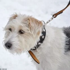 Een ontzettend mooie kwalitatieve hondenhalsband van echt zacht leer, de binnenkant heeft een beige kleur. De halsband is met subtiele sterren beslagen.