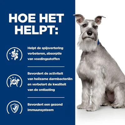Hill’s Prescription Diet heeft een groot wetenschappelijk getest assortiment hondenvoer voor verschillenden aandoeningen. Hill’s Prescription Diet Canine i/d Laag Vetgehalte kan bij storingen in het maagdarmstelsel worden gebruikt om het welzijn van het orgaan te herstellen en te verbeteren. De hoeveelheid vet in het hondenvoer is expres laag gehouden. Daarom is dit hondenvoer uitermate goed geschikt voor honden die neigen naar overgewicht. Onverteerbare voedingsvezels, prebiotische vezels, stimuleren de groei van goede bacteriën in de darmflora. Gember heeft een kalmerend effect in het maag-darmkanaal. Dankzij dit hondenvoer kan jouw hond definitief van zijn problemen af zijn en het risico dat de aandoening terug komt wordt geminimaliseerd.