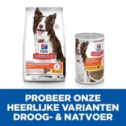 Het hondenvoer wordt bereid met licht verteerbare kip voor hoogwaardige eiwitten. Eiwitten zijn belangrijk voor het behoud van een slanke spiermassa. Hill’s Science Plan Adult Perfect Digestion met Kip bevat een speciale mix van prebiotische vezels die kunnen bijdragen aan een evenwichtige darmflora en een optimale werking van de spijsvertering. Bij regelmatig voeren kan het hondenvoer bijdragen aan een regelmatige stoelgang.