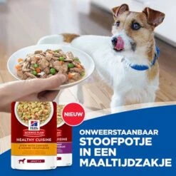 Heerlijk sappig en simpelweg lekker: met Hil’s Science Plan Canine Adult Healthy Cuisine met Kip & Rund wordt iedere maaltijd een feestmaal. Het is een appetijtelijk stoofpotje voor volwassen honden, dat met smaakvolle ingrediënten bereid is en perfect afgestemd is op de behoeftes van je lieveling.