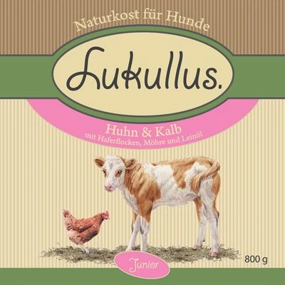 Fijne natuurkost Lukullus Junior Kip & Kalf voor puppies en jonge honden, natuurgetrouwe voeding, ideaal afgestemd op de individuele behoeften, met extra calcium voor harmonische groei.