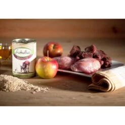 Lukullus natuurkost is een gezonde volwaardige voeding gemaakt van natuurlijke ingrediënten – konijn & wild met natuurrijst, appel en lijnzaadolie.