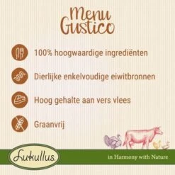 Lukullus heeft altijd natuurlijke en gastronomische recepten bereid en Lukullus Menu Gustico bevat hoogwaardige componenten die geschikt zijn voor menselijke consumptie, verwerkt in een fabriek in Neder-Beieren: recepten die rijk zijn aan micronutriënten en bronnen van vitamines, mineralen en essentiële sporenelementen. Nu zijn er nieuwe smaken beschikbaar, altijd vers en lekker. Bovendien zorgen ze voor de nodige voedingsstoffen. Alle recepten zijn graanvrij en goed verteerbaar voor honden van alle rassen en groottes.