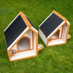 Asymmetrisch hondenhok met beschermende voorruimte. Openklapbaar dak gemaakt van weerbestendige pvc golfplaten. Voerbakken en houders inbegrepen. Met uniek design en levering als bouwpakket
