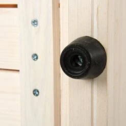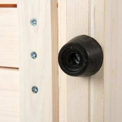 - Antislip rubberen voetjes: zorgen voor luchtcirculatie onder het hok, vormen een buffer tegen een koude vloer en houden het hout uit de buurt van de vochtige grond