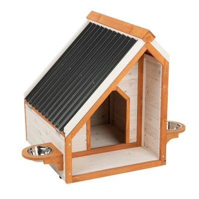 Het moderne hondenhok van robuust materiaal scoort ook met zijn doordachte constructie en duurzaamheid. Een royaal ontworpen voorruimte beschermt je viervoeter tegen wind en tocht, terwijl het waterbestendige PVC-golfdak ervoor zorgt dat het altijd droog blijft in het hondenhok. Het openklappende dak geeft je gemakkelijk toegang tot de binnenruimte. Bijzonder ingenieus zijn de twee voerbakhouders met bijpassende roestvrijstalen bakken, die in verschillende posities in het hondenhok kunnen worden gemonteerd.
