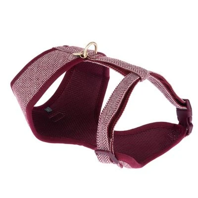Elegant hondentuig in vele maten, mooi visgraatpatroon, metalen elementen in mat goud, makkelijk aan te trekken, traploos verstelbaar, zacht en ademend, gemaakt van polyester en nylon, kleur: rood.