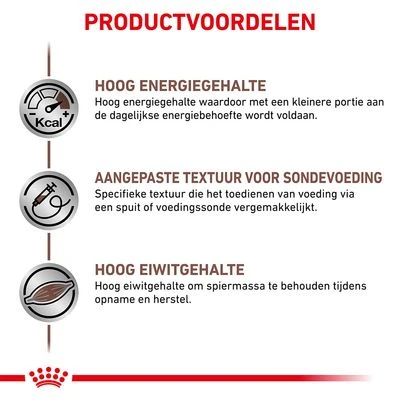 Royal Canin Veterinary Canine Recovery wordt gekenmerkt door een licht verteerbare, goed te verdragen samenstelling. Het dieetvoer is rijk aan eiwitten die belangrijk zijn voor het behoud van de spieren. Dankzij de extra zachte mousse kun je het natvoer op meerdere manieren geven: via een sonde of peroraal met behulp van een spuit. Het natte dieetvoer heeft een heerlijke smaak en wordt dus door veel dieren goed geaccepteerd.