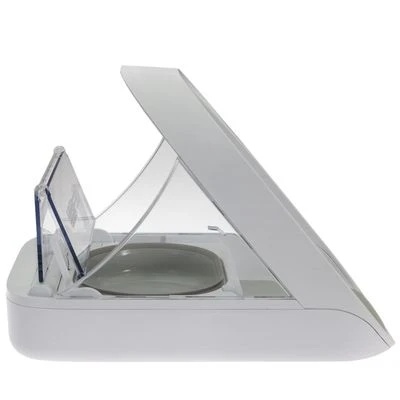 De voerautomaat heeft een microchip-gestuurde toegangscontrole, de microchip van uw huisdier wordt gescannd en in de toekomst door de voerautomaat weer herkend. De kelp van de automaat opent vervolgens alleen nog voor op de automaat toegelaten dieren (tot 32 dieren). Nadert een ander dier de voerbak dan opent de klep niet of sluit direct als hij nog open staat. De SureFeed Microchip Voerautomaat zorgt er dus voor, dat ieder dier het juiste en voor hem bedoelde voer eet. De deksel van de automaat sluit automatisch als het dier het sensor-gebied verlaat, de vertragingstijd kan in drie niveau’s worden ingesteld. De bovenkanten van de schaal zijn voorzien van een afdichting, die de voerbak verzegelt en vooral bij natvoer ervoor zorgt, dat het voer lang vers blijft.