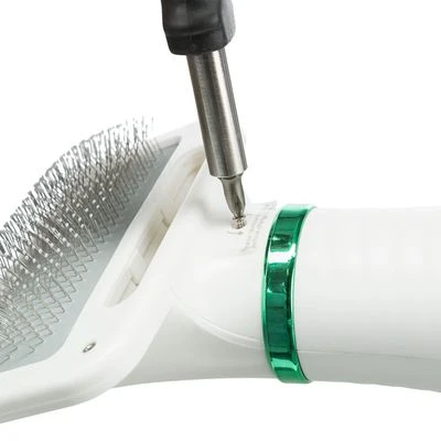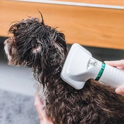 Elektrische hondenborstel met warmeluchteffect. Voor het borstelen en drogen na het baden. Helpt bij het ontharen. Met twee warmtestanden en geluidsarme motor. Voor lang- en kortharige honden.